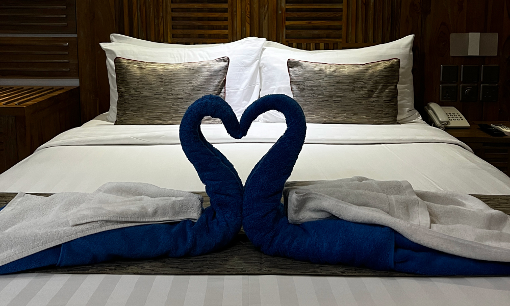 ハネムーンの場合は、ベッドには白鳥のタオルアートのベッドメイキングが施され、